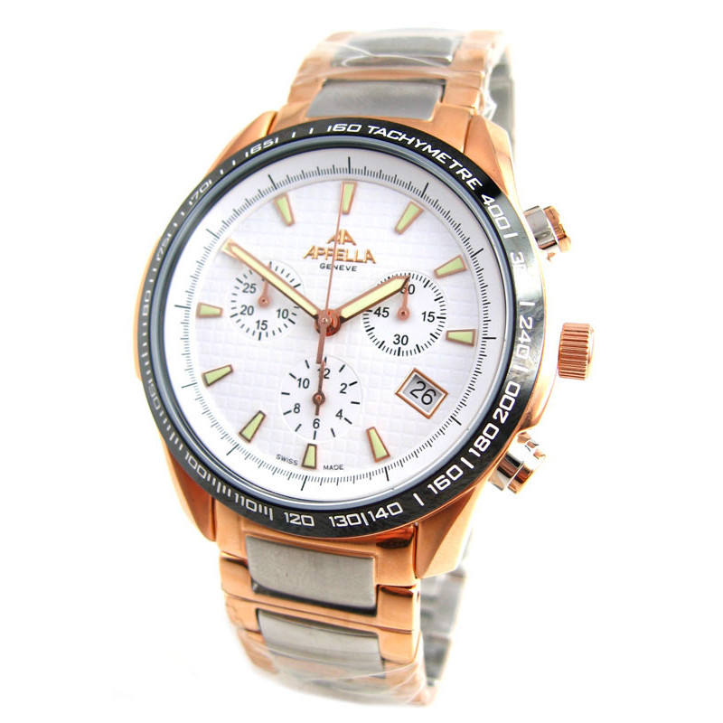 Модель имеет водонепроницаемость 30 м. Корпус выполнен из материала – сталь + PVD. Прочное минеральное стекло надежно защищает циферблат от ударов и других повреждений. Удобный стальной с позолотой браслет позволяет часам комфортно сидеть на запястье. Из дополнительных функций имеются: дата, хронограф.