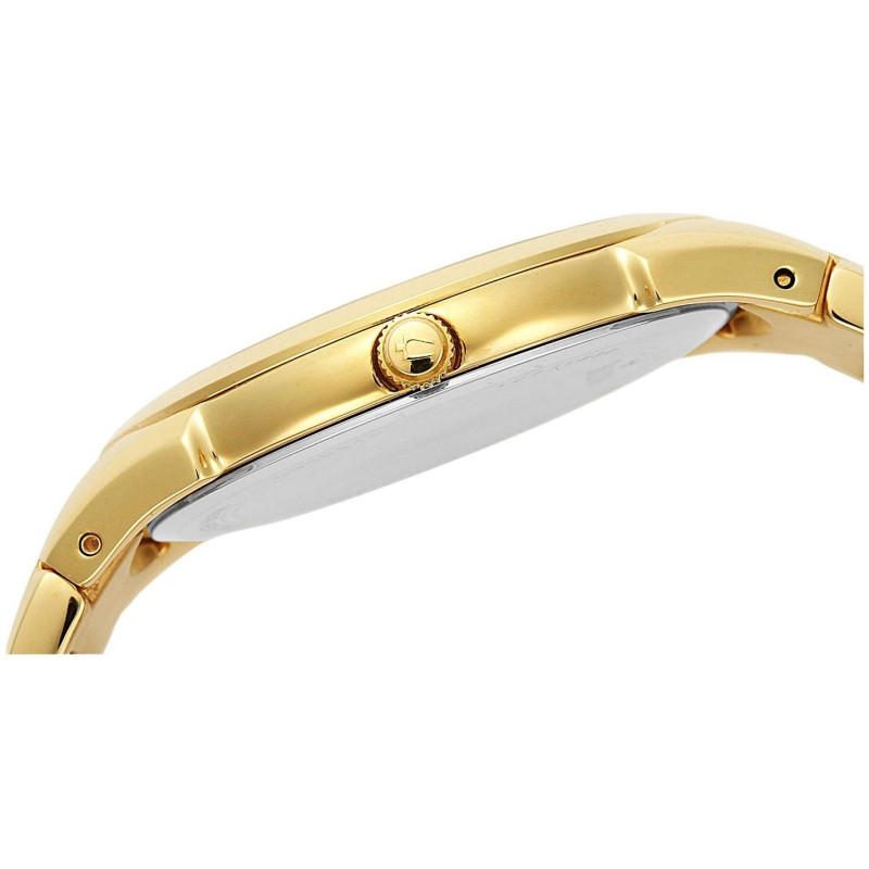 Модель имеет водонепроницаемость 30 м. Корпус выполнен из материала – сталь с позолотой. Прочное минеральное стекло надежно защищает циферблат от ударов и других повреждений. Удобный стальной с позолотой браслет позволяет часам комфортно сидеть на запястье. Из дополнительных функций имеются: дата, минуты, секунды, часы.