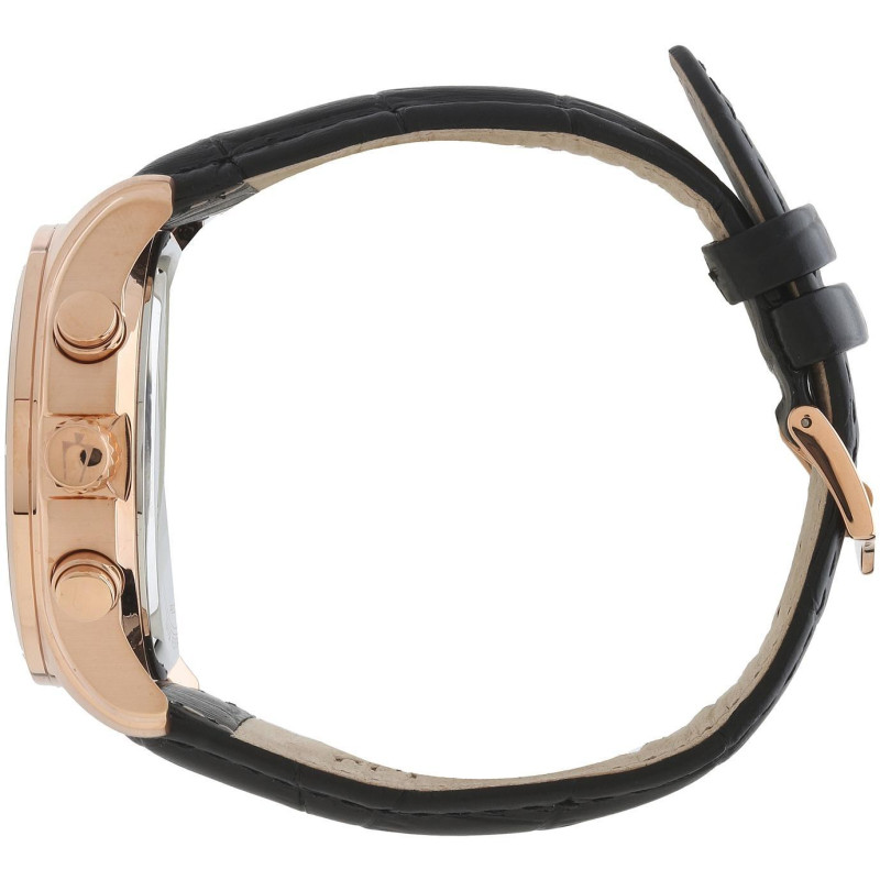 Модель имеет водонепроницаемость 50 м. Корпус выполнен из материала – сталь + PVD. Прочное минеральное стекло надежно защищает циферблат от ударов и других повреждений. Удобный кожаный ремешок позволяет часам комфортно сидеть на запястье. Из дополнительных функций имеются: дата, минуты, секунды, тахиметр, хронограф, часы.