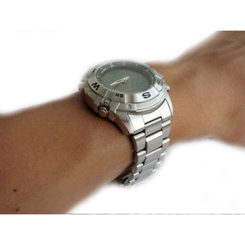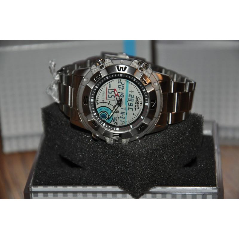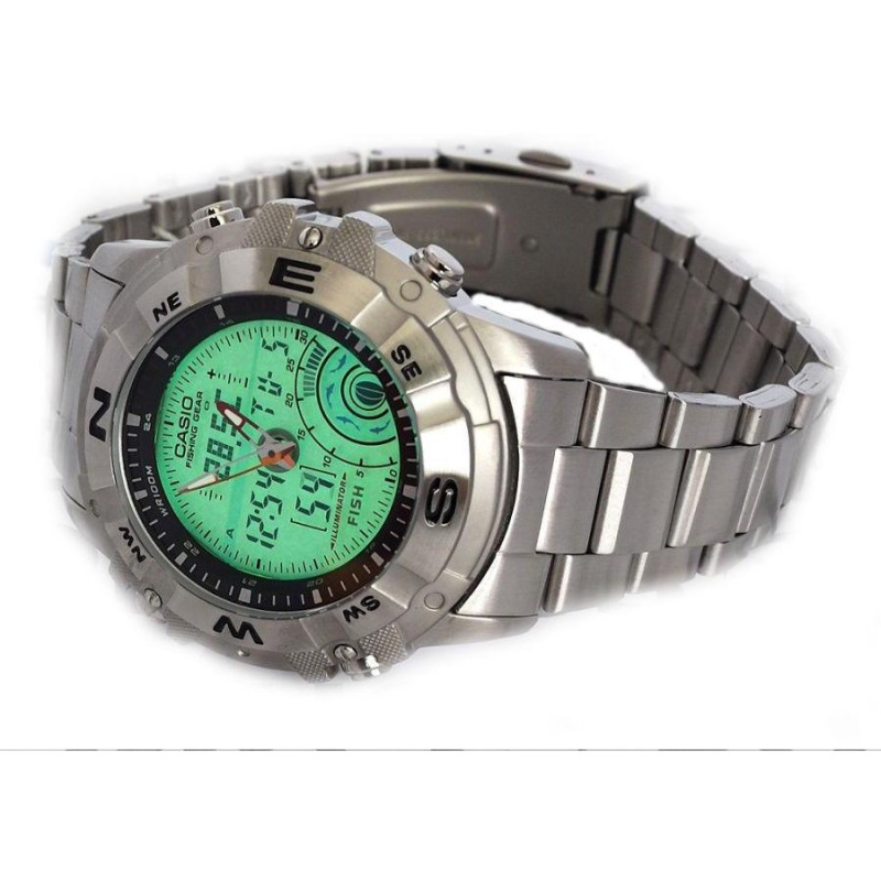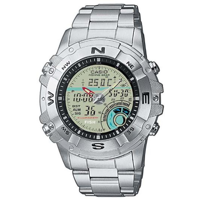 Модель имеет водонепроницаемость 100 м. Корпус выполнен из материала – сталь. Прочное минеральное стекло надежно защищает циферблат от ударов и других повреждений. Удобный стальной браслет позволяет часам комфортно сидеть на запястье. Из дополнительных функций имеются: 12 и 24-часовой формат времени, автоматический календарь, измерение температуры, мировое время, мульти-сигнал, отображение возраста и фазы луны, секундомер, таймер для рыбалки, таймер обратного отсчёта.