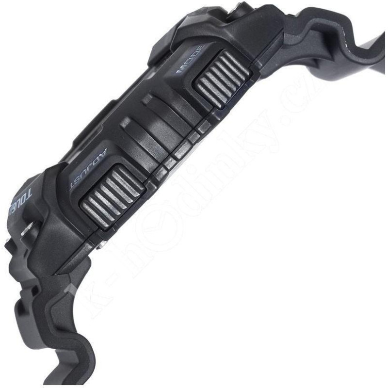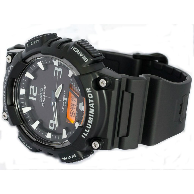 Модель имеет водонепроницаемость 100 м. Корпус выполнен из материала – полимер. Прочное пластиковое стекло надежно защищает циферблат от ударов и других повреждений. Удобный полимер ремешок позволяет часам комфортно сидеть на запястье. Из дополнительных функций имеются: 5 будильников, GMT, автоматический календарь, индикатор запаса хода, светодиодная подсветка, секундомер, солнечная батарея, таймер.