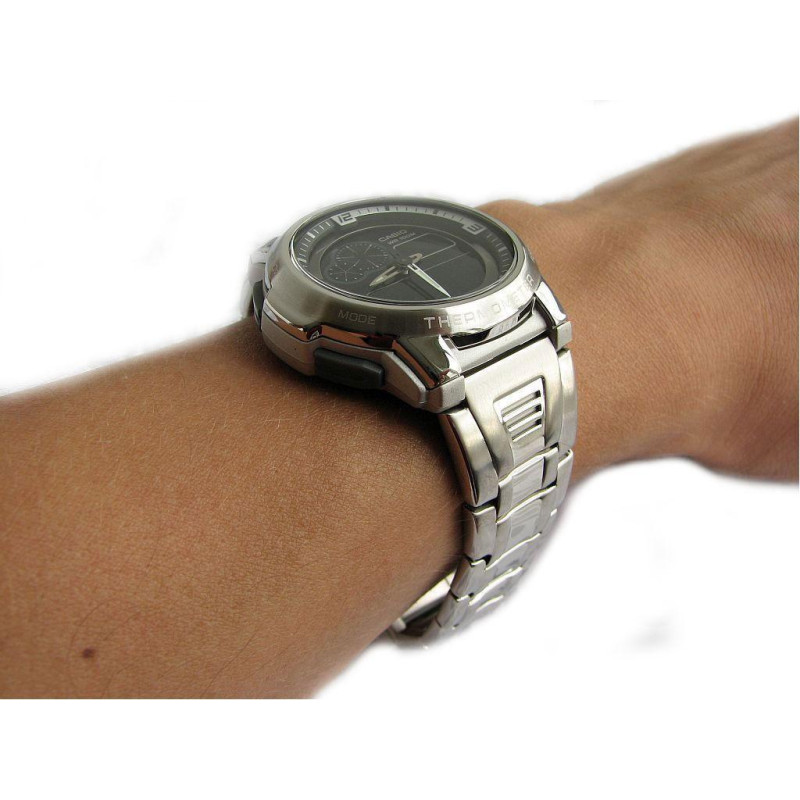 Модель имеет водонепроницаемость 100 м. Корпус выполнен из материала – сталь. Прочное минеральное стекло надежно защищает циферблат от ударов и других повреждений. Удобный стальной браслет позволяет часам комфортно сидеть на запястье. Из дополнительных функций имеются: 12 и 24-часовой формат времени, автоматический календарь, данные о прохождении этапов, измерение температуры, мировое время, мульти-сигнал, секундомер, таймер обратного отсчёта.