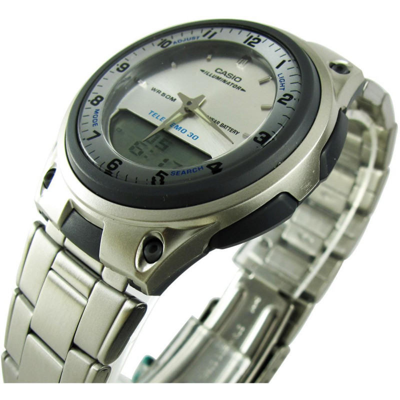 Модель имеет водонепроницаемость 50 м. Корпус выполнен из материала – полимер. Прочное пластиковое стекло надежно защищает циферблат от ударов и других повреждений. Удобный стальной браслет позволяет часам комфортно сидеть на запястье. Из дополнительных функций имеются: 12 и 24-часовой формат времени, будильник, календарь, отображение возраста и фазы луны, светодиодная подсветка, секундомер, таймер обратного отсчёта.