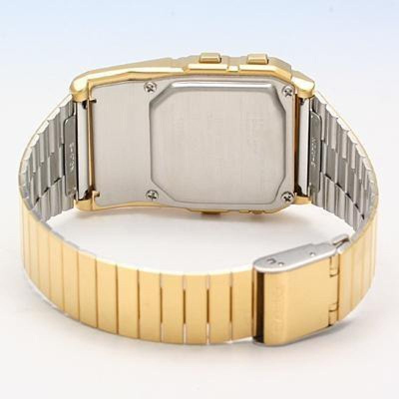 Модель имеет водонепроницаемость 30 м. Корпус выполнен из материала – пластик. Прочное пластиковое стекло надежно защищает циферблат от ударов и других повреждений. Удобный сталь + PVD браслет позволяет часам комфортно сидеть на запястье. Из дополнительных функций имеются: 12 и 24-часовой формат времени, GMT, автоматический календарь, будильник, дата, день недели, калькулятор, конвертер валют, светодиодная подсветка, секундомер, секунды, таймер обратного отсчёта, телефонная книжка.