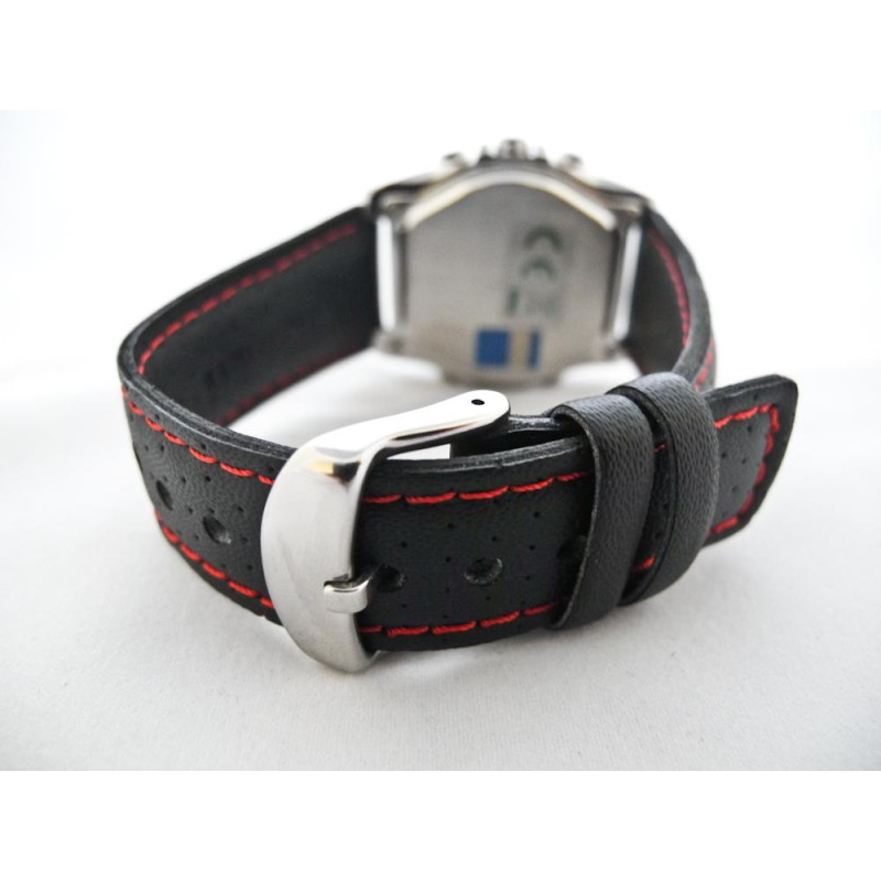 Модель имеет водонепроницаемость 100 м. Корпус выполнен из материала – сталь. Прочное минеральное стекло надежно защищает циферблат от ударов и других повреждений. Удобный кожаный ремешок позволяет часам комфортно сидеть на запястье. Из дополнительных функций имеются: 12 и 24-часовой формат времени, автоматический календарь, измерение температуры, мировое время, мульти-сигнал, напоминание, секундомер, таймер обратного отсчёта, электролюминесцентная подсветка.