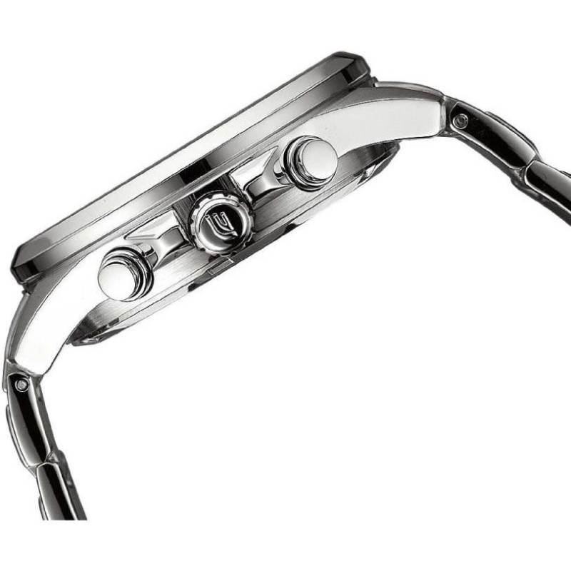 Модель имеет водонепроницаемость 100 м. Корпус выполнен из материала – сталь. Прочное минеральное стекло надежно защищает циферблат от ударов и других повреждений. Удобный стальной браслет позволяет часам комфортно сидеть на запястье. Из дополнительных функций имеются: дата, дополнительный показатель времени в 24-х часовом формате, минуты, необрит, секунды, хронограф, часы.