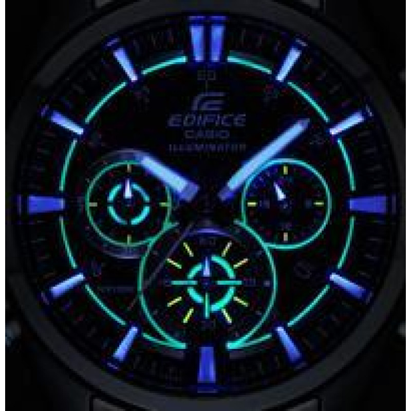 Модель имеет водонепроницаемость 100 м. Корпус выполнен из материала – сталь + PVD. Прочное минеральное стекло надежно защищает циферблат от ударов и других повреждений. Удобный стальной браслет позволяет часам комфортно сидеть на запястье. Из дополнительных функций имеются: дата, дополнительный показатель времени в 24-х часовом формате, неоновая подсветка, секунды, хронограф.