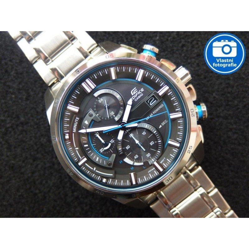 Модель имеет водонепроницаемость 100 м. Корпус выполнен из материала – сталь. Прочное минеральное стекло надежно защищает циферблат от ударов и других повреждений. Удобный стальной браслет позволяет часам комфортно сидеть на запястье. Из дополнительных функций имеются: дата, индикатор зарядa элемента питания, необрит, секунды, солнечная батарея, хронограф.