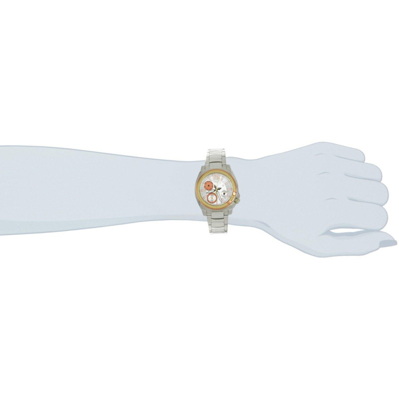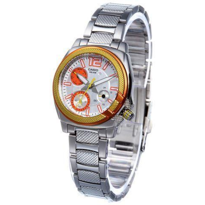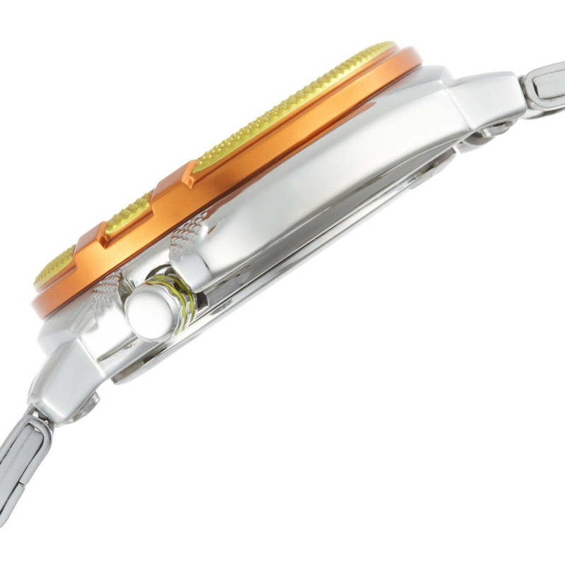 Безель покрыт жёлтым и оранжевым PVD-покрытием. Циферблат серебристого цвета с оранжевыми элементами..