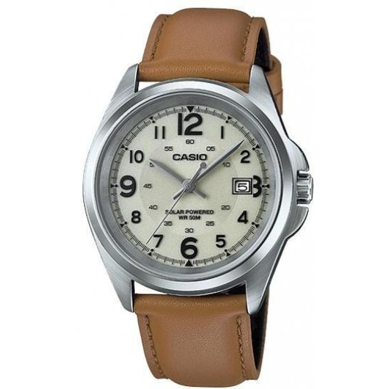 Модель имеет водонепроницаемость 50 м. Корпус выполнен из материала – сталь. Прочное пластиковое стекло надежно защищает циферблат от ударов и других повреждений. Удобный кожаный ремешок позволяет часам комфортно сидеть на запястье. Из дополнительных функций имеются: дата, секунды, солнечная батарея.
