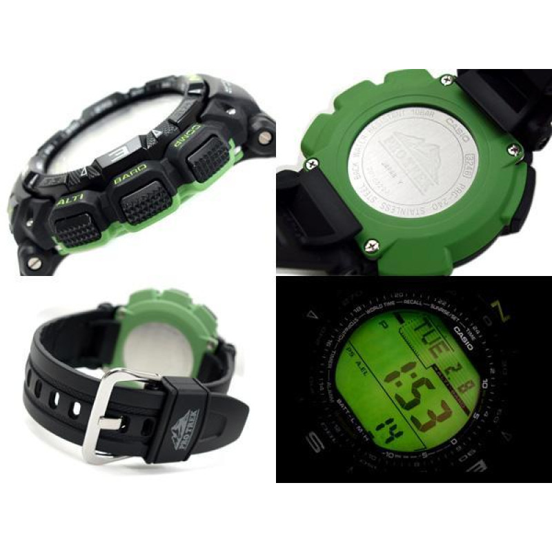 Модель имеет водонепроницаемость 100 м. Корпус выполнен из материала – полимер. Прочное минеральное стекло надежно защищает циферблат от ударов и других повреждений. Удобный полимер ремешок позволяет часам комфортно сидеть на запястье. Из дополнительных функций имеются: 1/100-с секундомер, 12 и 24-часовой формат времени, автоматический календарь, альтиметр, высотомер, дата, день недели, ежедневный сигнал, ежечасный сигнал, измерение температуры, индикатор зарядa элемента питания, компас, мировое время, морозоустойчивые, отображение восхода и захода солнца, полностью автоматическая электролюминесцентная подсветка, солнечная батарея, таймер обратного отсчёта, термометр, функция включения/отключения звука.