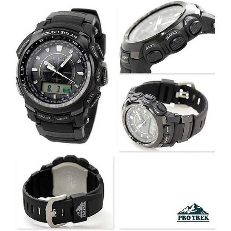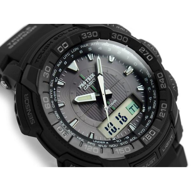 Модель имеет водонепроницаемость 100 м. Корпус выполнен из материала – пластик. Прочное минеральное стекло надежно защищает циферблат от ударов и других повреждений. Удобный полимер ремешок позволяет часам комфортно сидеть на запястье. Из дополнительных функций имеются: 1/100-с секундомер, 5 будильников, альтиметр, календарь, компас, мировое время, светодиодная автоподсветка, солнечная батарея, таймер, термометр.