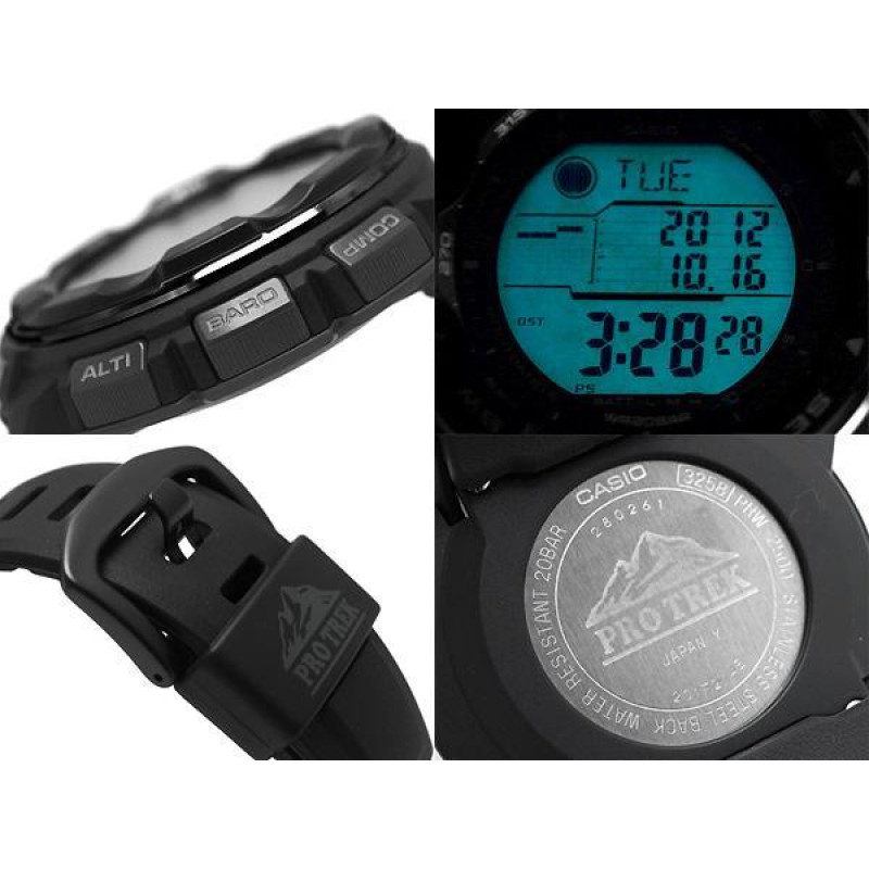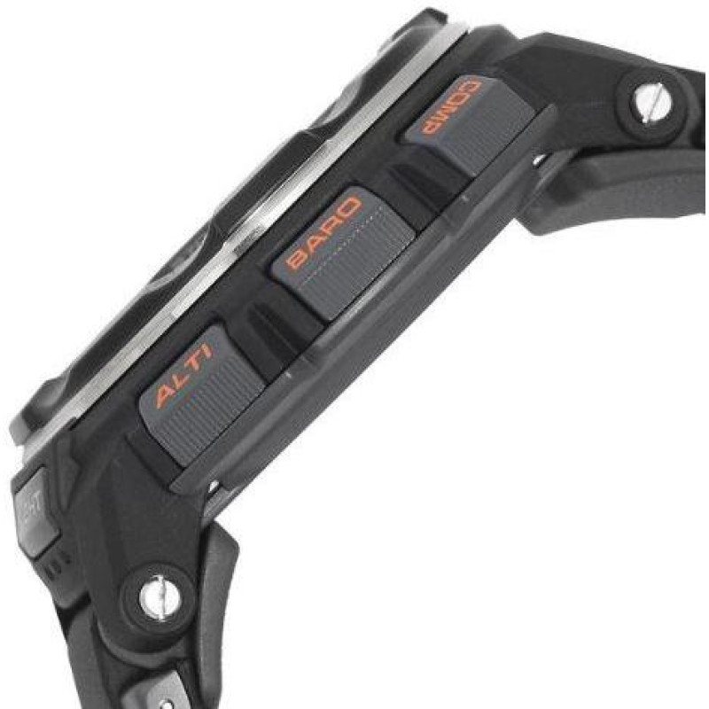 Модель имеет водонепроницаемость 200 м. Корпус выполнен из материала – полимер. Прочное минеральное стекло надежно защищает циферблат от ударов и других повреждений. Удобный полимер ремешок позволяет часам комфортно сидеть на запястье. Из дополнительных функций имеются: 1/100-с секундомер, 12 и 24-часовой формат времени, 5 будильников, автоматический календарь, альтиметр - данные памяти, вращающийся безель, высотомер, дата, двойной ЖК дисплей, день недели, индикатор зарядa элемента питания, компас, минуты, мировое время, морозоустойчивые, отображение возраста и фазы луны, отображение восхода и захода солнца, отображение таблицы приливов-отливов, полностью автоматическая электролюминесцентная подсветка, прием радиосигнала, секунды, солнечная батарея, таймер обратного отсчёта, термометр, функция включения/отключения звука, часы, яхт-таймер.