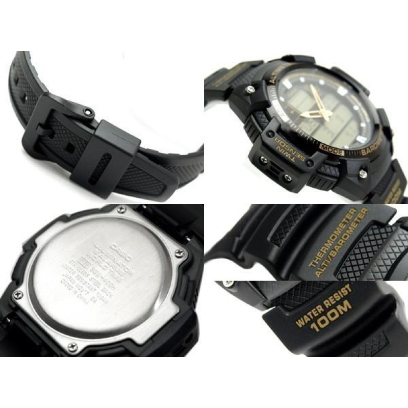 Модель имеет водонепроницаемость 100 м. Корпус выполнен из материала – полимер. Прочное пластиковое стекло надежно защищает циферблат от ударов и других повреждений. Удобный полимер ремешок позволяет часам комфортно сидеть на запястье. Из дополнительных функций имеются: 1/100-с секундомер, 5 будильников, высотомер, календарь, мировое время, термометр, электролюминесцентная автоподсветка.