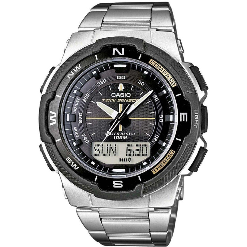 Модель имеет водонепроницаемость 100 м. Корпус выполнен из материала – полимер и сталь. Прочное пластиковое стекло надежно защищает циферблат от ударов и других повреждений. Удобный стальной браслет позволяет часам комфортно сидеть на запястье. Из дополнительных функций имеются: 1/100-с секундомер, 12 и 24-часовой формат времени, 5 будильников, автоматический календарь, вращающийся безель, дата, день недели, компас, минуты, мировое время, отображение возраста и фазы луны, отображение восхода и захода солнца, секунды, таймер обратного отсчёта, термометр, функция включения/отключения звука, часы, электролюминесцентная подсветка.