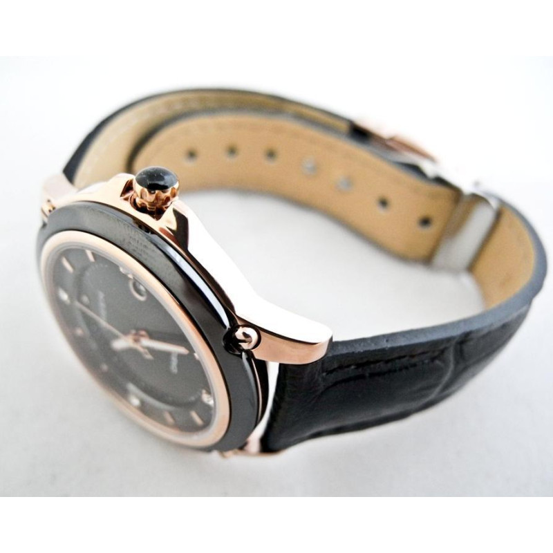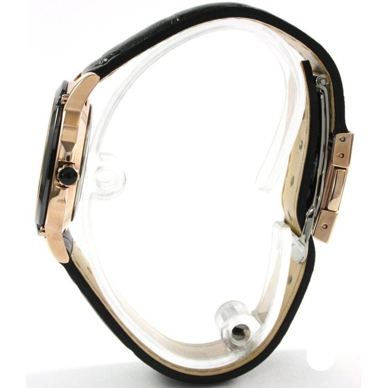 Модель имеет водонепроницаемость 50 м. Корпус выполнен из материала – сталь + PVD. Прочное сапфировое стекло надежно защищает циферблат от ударов и других повреждений. Удобный кожаный ремешок позволяет часам комфортно сидеть на запястье. Из дополнительных функций имеются: дата, минуты, секунды, часы.