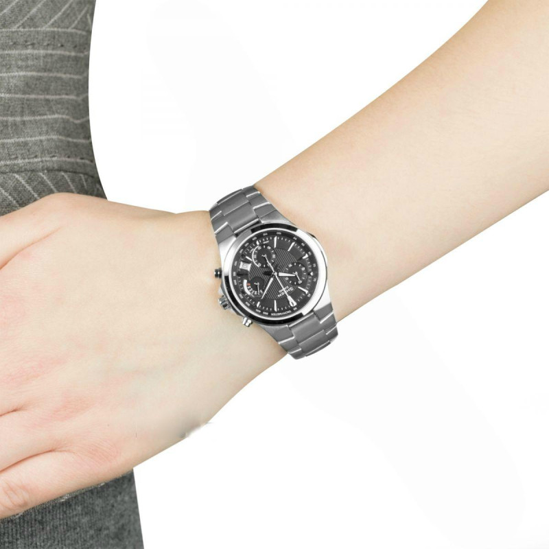 Модель имеет водонепроницаемость 50 м. Корпус выполнен из материала – сталь. Прочное минеральное стекло надежно защищает циферблат от ударов и других повреждений. Удобный стальной браслет позволяет часам комфортно сидеть на запястье. Из дополнительных функций имеются: дата, день недели, секунды, тахиметр, хронограф.