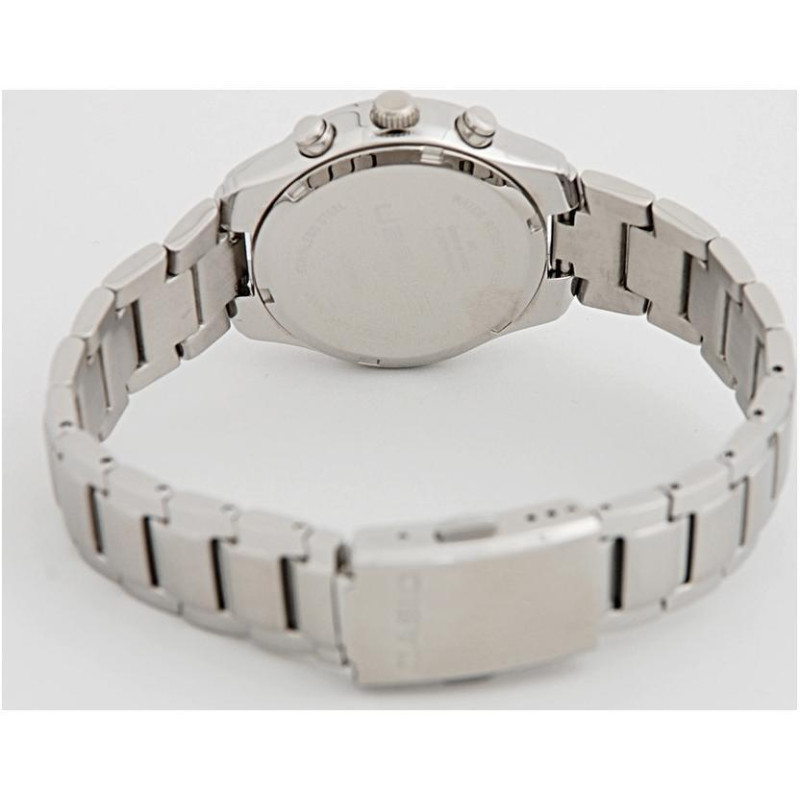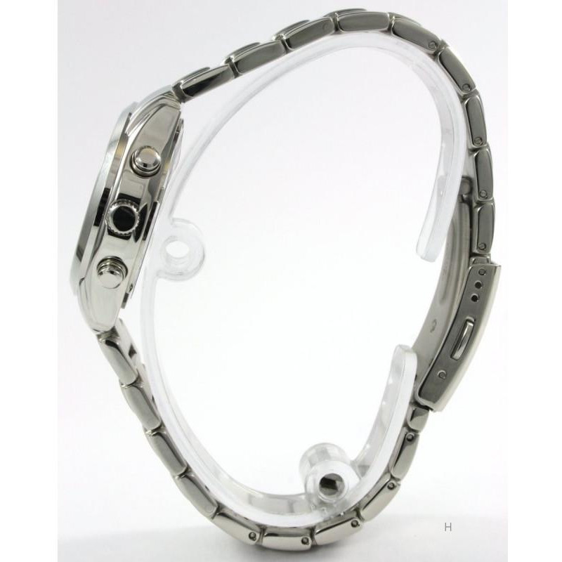 Модель имеет водонепроницаемость 50 м. Корпус выполнен из материала – сталь. Прочное минеральное стекло надежно защищает циферблат от ударов и других повреждений. Удобный стальной браслет позволяет часам комфортно сидеть на запястье. Из дополнительных функций имеются: дата, дополнительный показатель времени в 24-х часовом формате, секунды, тахиметр, хронограф.