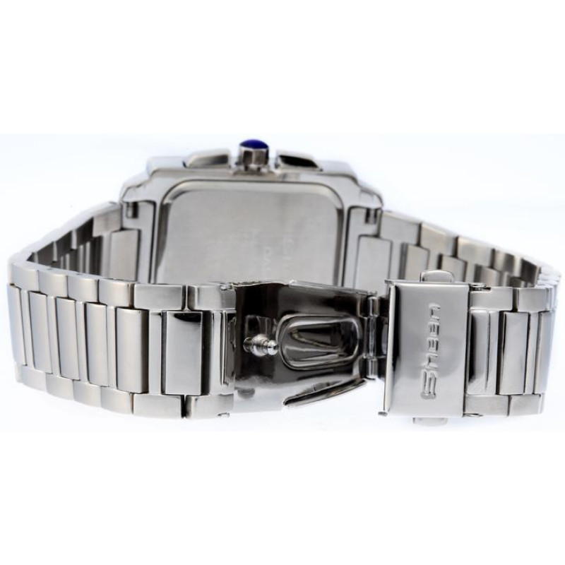 Модель имеет водонепроницаемость 30 м. Корпус выполнен из материала – сталь. Прочное сапфировое стекло надежно защищает циферблат от ударов и других повреждений. Удобный стальной браслет позволяет часам комфортно сидеть на запястье. Из дополнительных функций имеются: дата, дополнительный показатель времени в 24-х часовом формате, индикация день-ночь, секунды, хронограф.