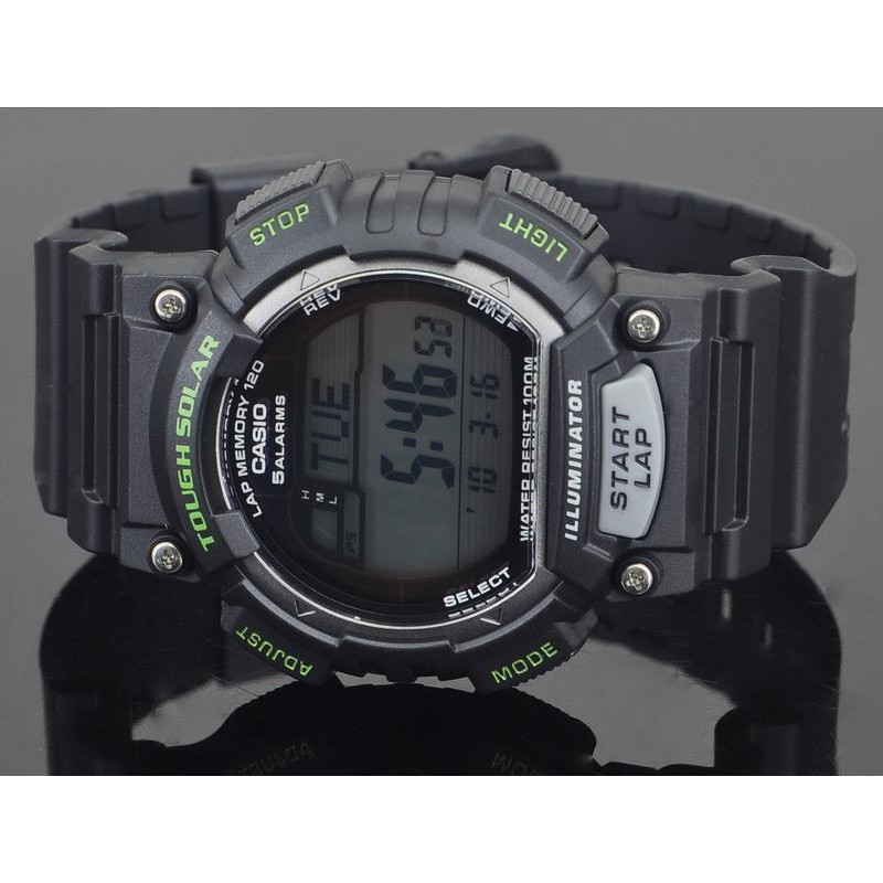 Модель имеет водонепроницаемость 100 м. Корпус выполнен из материала – пластик. Прочное пластиковое стекло надежно защищает циферблат от ударов и других повреждений. Удобный пластик ремешок позволяет часам комфортно сидеть на запястье. Из дополнительных функций имеются: 1/100-с секундомер, 12 и 24-часовой формат времени, 5 будильников, автоматический календарь, данные о прохождении этапов, дата, день недели, индикатор зарядa элемента питания, светодиодная подсветка, секунды, солнечная батарея, таймер, функция включения/отключения звука, функция повтора сигнала.
