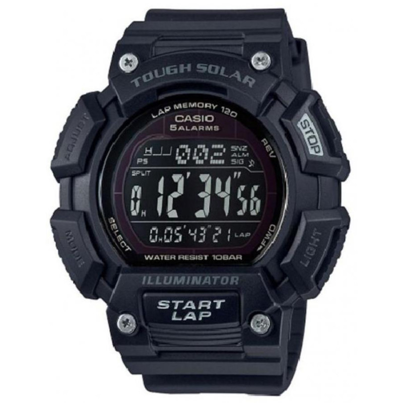 Модель имеет водонепроницаемость 100 м. Корпус выполнен из материала – пластик. Прочное пластиковое стекло надежно защищает циферблат от ударов и других повреждений. Удобный полимер ремешок позволяет часам комфортно сидеть на запястье. Из дополнительных функций имеются: 1/100-с секундомер, 12 и 24-часовой формат времени, 5 будильников, автоматический календарь, включение/отключение звука кнопок, ежечасный сигнал, индикатор зарядa элемента питания, мировое время, солнечная батарея, таймер обратного отсчёта, функция повтора сигнала, электролюминесцентная подсветка.