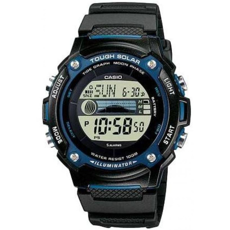 Модель имеет водонепроницаемость 100 м. Корпус выполнен из материала – полимер. Прочное минеральное стекло надежно защищает циферблат от ударов и других повреждений. Удобный полимер ремешок позволяет часам комфортно сидеть на запястье. Из дополнительных функций имеются: 1/100-с секундомер, 12 и 24-часовой формат времени, автоматический календарь, дата, день недели, ежедневный сигнал, ежечасный сигнал, мировое время, отображение возраста и фазы луны, отображение таблицы приливов-отливов, светодиодная подсветка, солнечная батарея, таймер обратного отсчёта, функция включения/отключения звука.