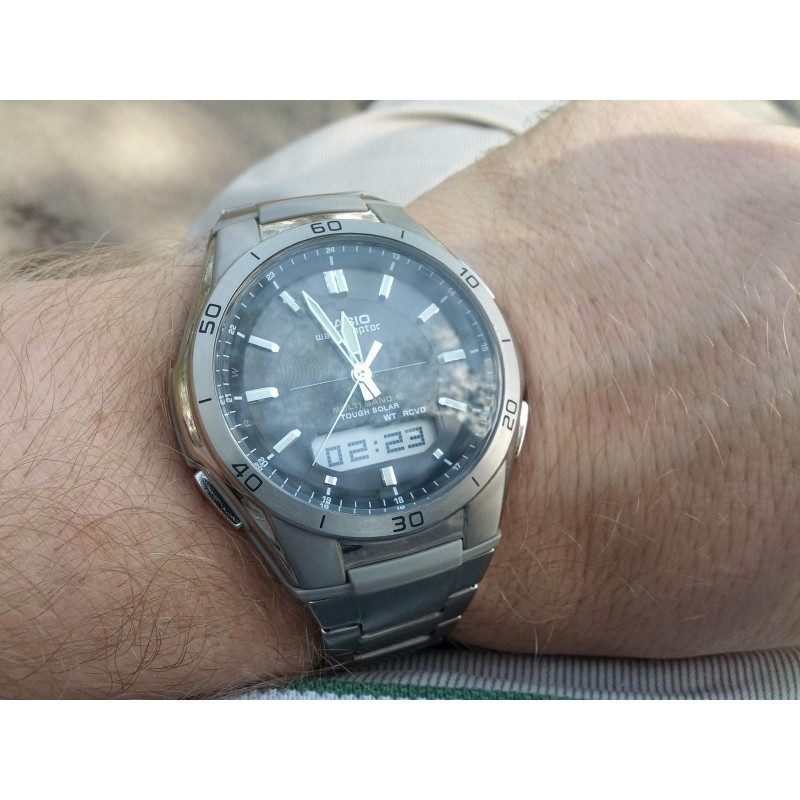 Модель имеет водонепроницаемость 100 м. Корпус выполнен из материала – титан. Прочное минеральное стекло надежно защищает циферблат от ударов и других повреждений. Удобный титановый браслет позволяет часам комфортно сидеть на запястье. Из дополнительных функций имеются: 1/100-с секундомер, 12 и 24-часовой формат времени, 5 будильников, автоматический календарь, индикатор зарядa элемента питания, мировое время, прием радиосигнала, светодиодная подсветка, секунды, солнечная батарея, таймер обратного отсчёта, функция включения/отключения звука, функция повтора сигнала.