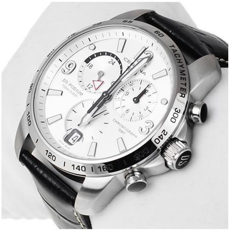Модель имеет водонепроницаемость 100 м. Корпус выполнен из материала – сталь. Прочное сапфировое стекло надежно защищает циферблат от ударов и других повреждений. Удобный кожаный ремешок позволяет часам комфортно сидеть на запястье. Из дополнительных функций имеются: дата, дополнительный показатель времени в 24-х часовом формате, индикатор зарядa элемента питания, тахиметр, хронограф.