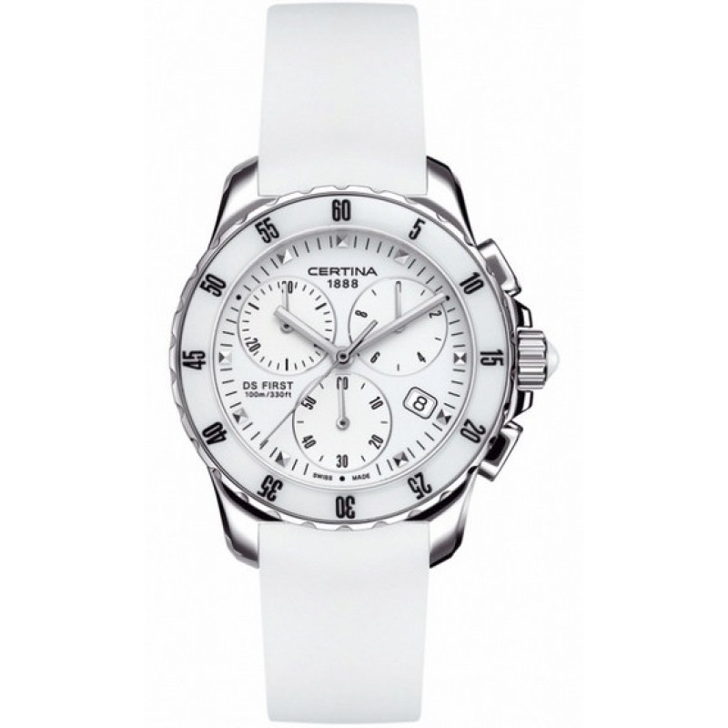 Certina C014.217.17.011.00 – женская спортивная модель с нотками fashion-стиля. Ее яркая белая огран..