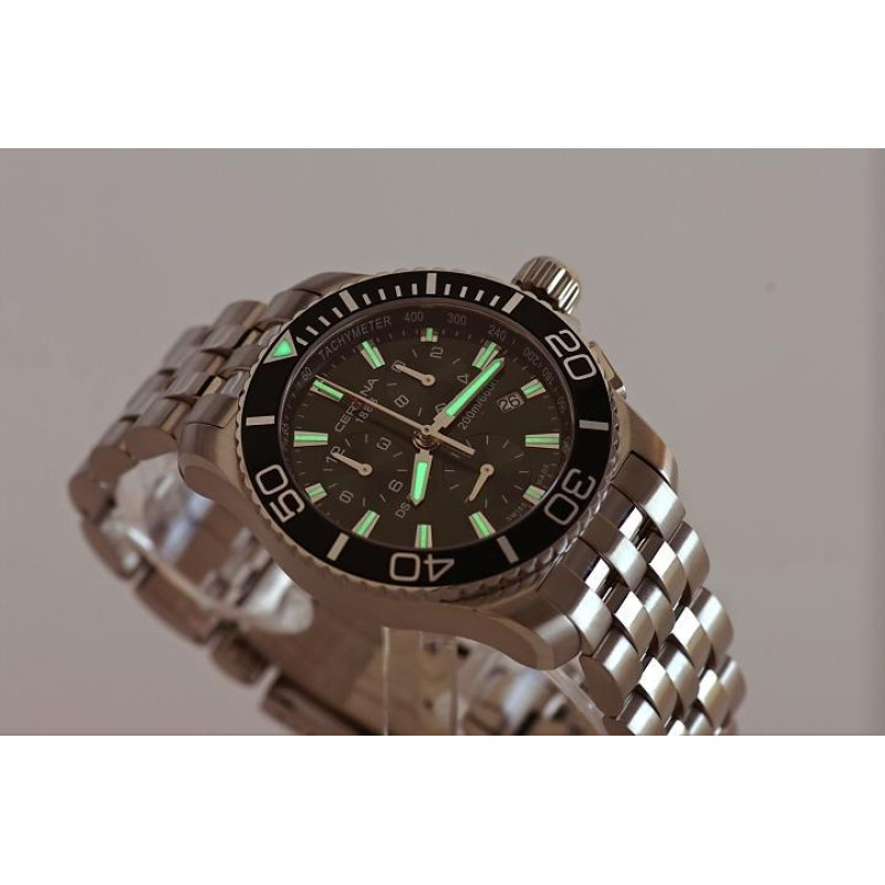 Модель имеет водонепроницаемость 200 м. Корпус выполнен из материала – сталь + PVD. Прочное сапфировое стекло надежно защищает циферблат от ударов и других повреждений. Удобный стальной браслет позволяет часам комфортно сидеть на запястье. Из дополнительных функций имеются: дата, индикатор зарядa элемента питания, секунды, тахиметр, хронограф.