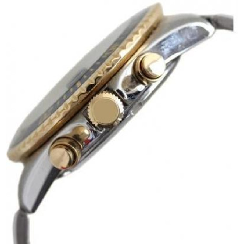 Модель имеет водонепроницаемость 100 м. Корпус выполнен из материала – сталь + PVD. Прочное минеральное стекло надежно защищает циферблат от ударов и других повреждений. Удобный стальной с позолотой браслет позволяет часам комфортно сидеть на запястье. Из дополнительных функций имеются: дата, хронограф.