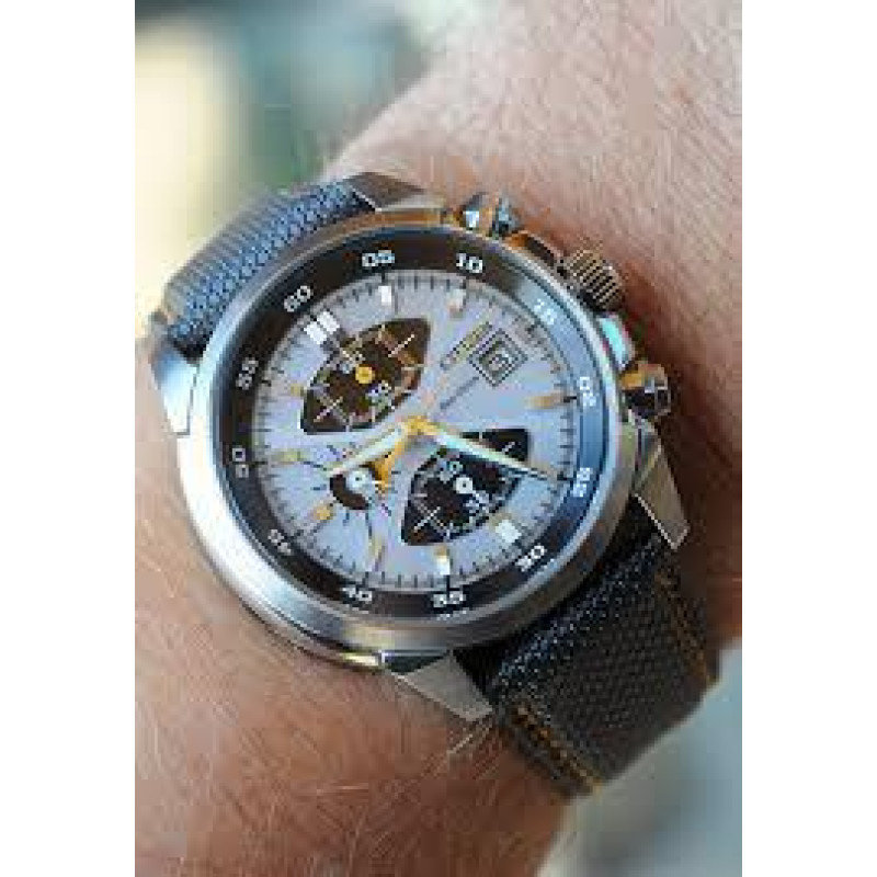 Модель имеет водонепроницаемость 100 м. Корпус выполнен из материала – сталь. Прочное минеральное стекло надежно защищает циферблат от ударов и других повреждений. Удобный тканевый ремешок позволяет часам комфортно сидеть на запястье. Из дополнительных функций имеются: дата, дополнительный показатель времени в 24-х часовом формате, хронограф.