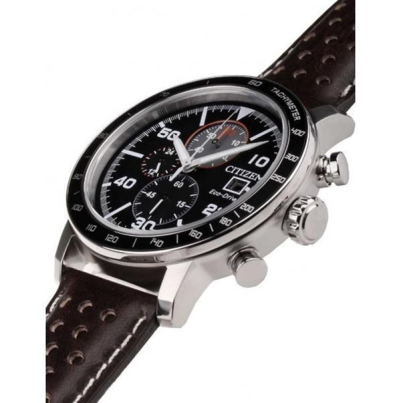 Модель имеет водонепроницаемость 100 м. Корпус выполнен из материала – сталь. Прочное минеральное стекло надежно защищает циферблат от ударов и других повреждений. Удобный кожаный ремешок позволяет часам комфортно сидеть на запястье. Из дополнительных функций имеются: EOL, дата, дополнительный показатель времени в 24-х часовом формате, секунды, хронограф.