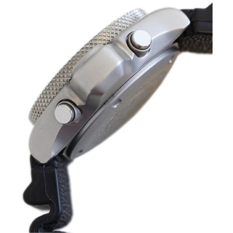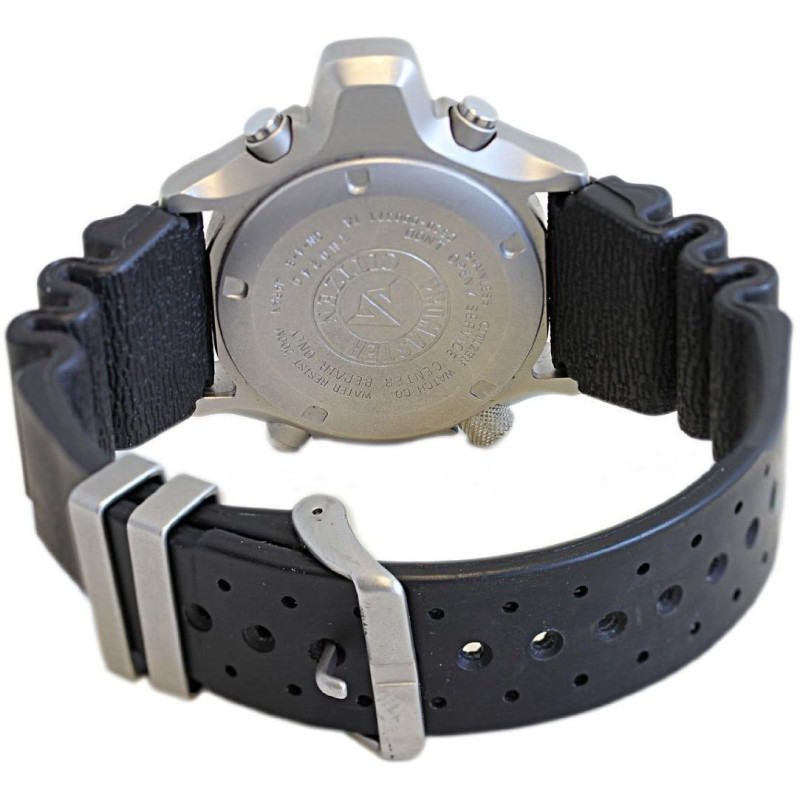 Модель имеет водонепроницаемость 200 м. Корпус выполнен из материала – сталь + PVD. Прочное минеральное стекло надежно защищает циферблат от ударов и других повреждений. Удобный каучук ремешок позволяет часам комфортно сидеть на запястье. Из дополнительных функций имеются: 12 и 24-часовой формат времени, автоматический календарь, будильник, вращающийся безель, глубиномер, дата, минуты, секунды, хронограф, часы.
