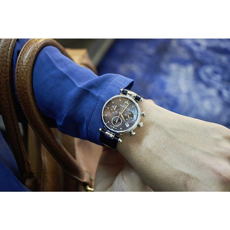 Модель имеет водонепроницаемость 30 м. Корпус выполнен из материала – сталь + PVD. Прочное сапфировое стекло надежно защищает циферблат от ударов и других повреждений. Удобный кожаный ремешок позволяет часам комфортно сидеть на запястье. Из дополнительных функций имеются: дата, секунды, хронограф.