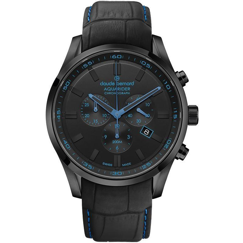 Модель имеет водонепроницаемость 200 м. Корпус выполнен из материала – сталь + PVD. Прочное сапфировое стекло надежно защищает циферблат от ударов и других повреждений. Удобный кожаный ремешок позволяет часам комфортно сидеть на запястье. Из дополнительных функций имеются: дата, секунды, хронограф.