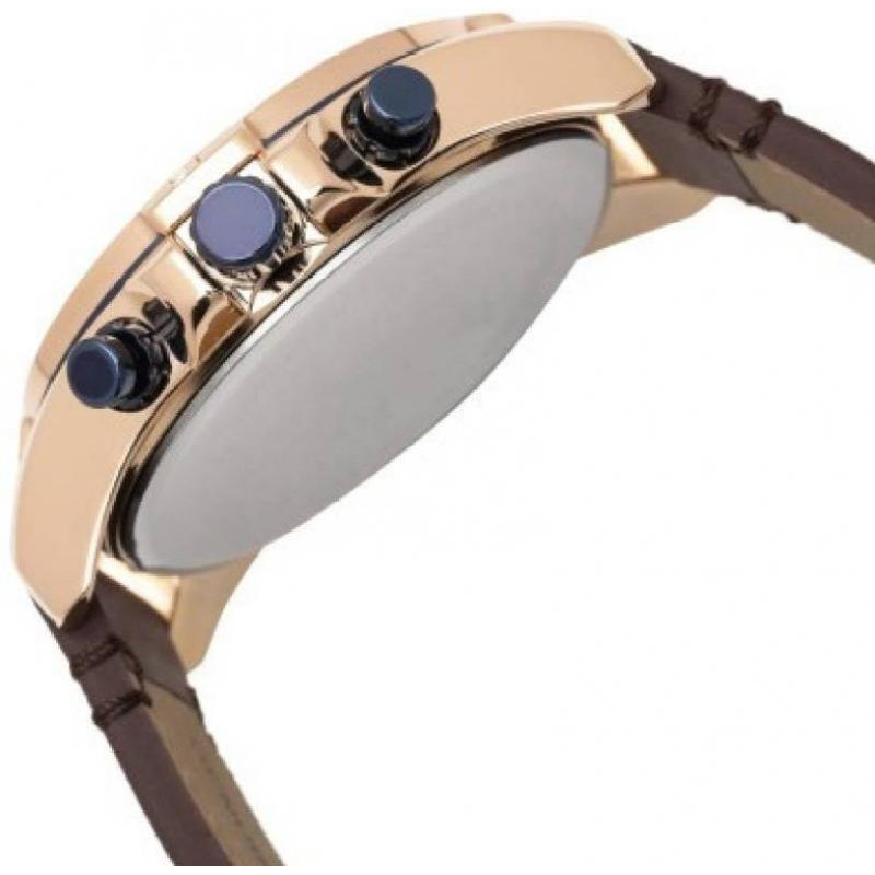 Модель имеет водонепроницаемость 50 м. Корпус выполнен из материала – латунь + PVD. Прочное минеральное стекло надежно защищает циферблат от ударов и других повреждений. Удобный кожаный ремешок позволяет часам комфортно сидеть на запястье. Из дополнительных функций имеются: дата, день недели, дополнительный показатель времени в 24-х часовом формате, секунды.