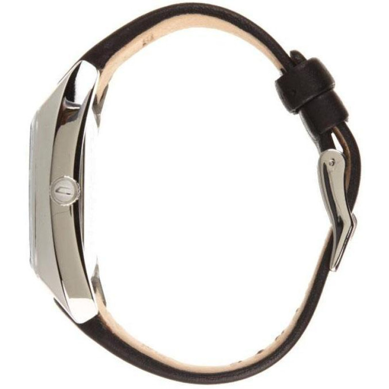 Корпус выполнен из нержавеющей стали. Чёрный кожаный ремешок. Цвет циферблата — серебристый. Индикац..