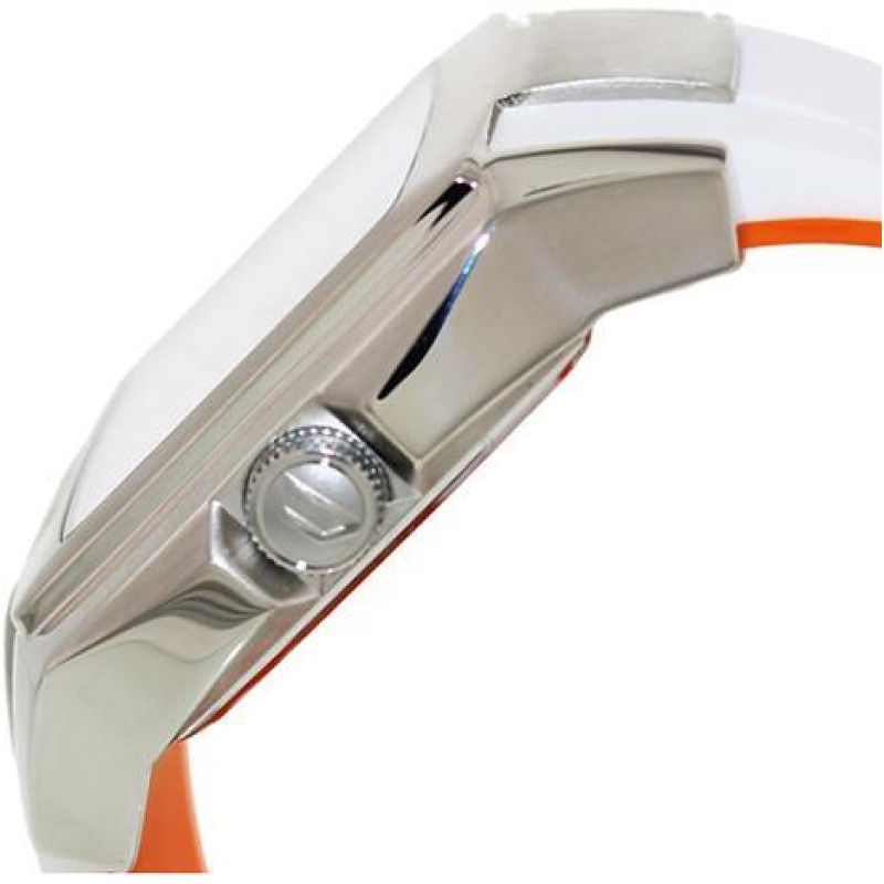 Корпус выполнен из нержавеющей стали. Белый кожаный ремешок с наружи, и оранжевый с внутренней сторо..