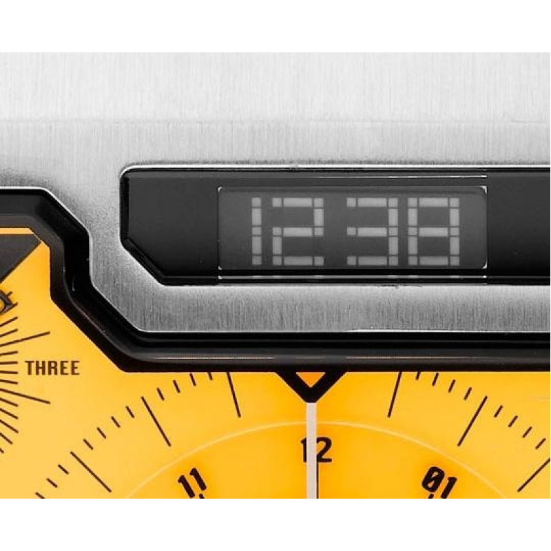Корпус выполнен из нержавеющей стали. Черный тканевый ремешок. Цвет циферблата — желтый. Индикация —..