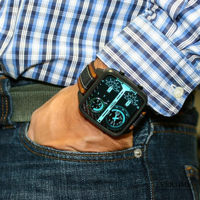 Модель имеет водонепроницаемость 50 м. Корпус выполнен из материала – сталь + PVD. Прочное минеральное стекло надежно защищает циферблат от ударов и других повреждений. Удобный комбинированный (кожа/ткань) ремешок позволяет часам комфортно сидеть на запястье. Из дополнительных функций имеются: отображение текущего времени в 4-х разных часовых поясах, секунды.