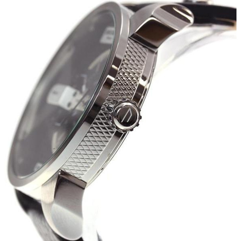 Корпус выполнен из стали. Черный кожаный ремешок. Циферблат - черный, гильошированный. Индикация — а..
