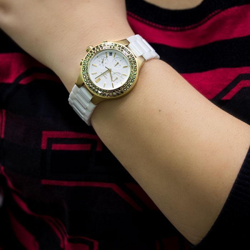 Модель имеет водонепроницаемость 30 м. Корпус выполнен из материала – сталь + PVD. Прочное минеральное стекло надежно защищает циферблат от ударов и других повреждений. Удобный керамический браслет позволяет часам комфортно сидеть на запястье. Из дополнительных функций имеются: дата, день недели, дополнительный показатель времени в 24-х часовом формате, секунды, хронограф.