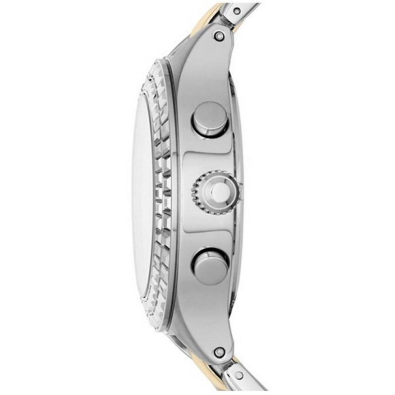Модель имеет водонепроницаемость 30 м. Корпус выполнен из материала – сталь + PVD. Прочное минеральное стекло надежно защищает циферблат от ударов и других повреждений. Удобный сталь + PVD браслет позволяет часам комфортно сидеть на запястье. Из дополнительных функций имеются: дата, день недели, дополнительный показатель времени в 24-х часовом формате, секунды, хронограф.
