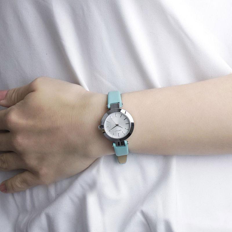 Корпус выполнен из стали. Бирюзовый кожаный ремешок. Цвет циферблата - серебристый. Индикация - метк..
