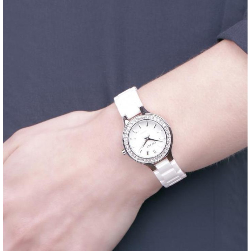 Корпус выполнен из стали. Белый керамический браслет. Цвет циферблата — серебристый. Индикация - мет..