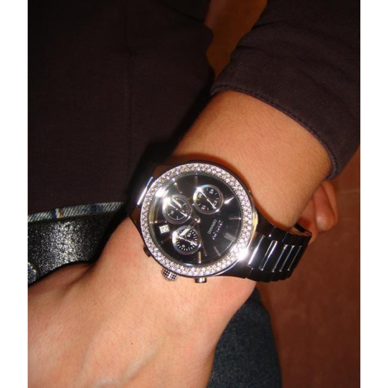 Модель имеет водонепроницаемость 50 м. Корпус выполнен из материала – сталь. Прочное минеральное стекло надежно защищает циферблат от ударов и других повреждений. Удобный керамический браслет позволяет часам комфортно сидеть на запястье. Из дополнительных функций имеются: дата, дополнительный показатель времени в 24-х часовом формате, секунды, хронограф.
