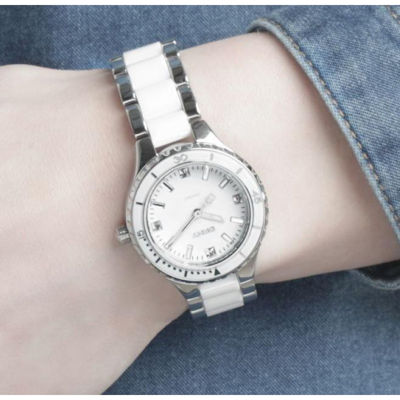 Корпус выполнен из стали. Белый керамический браслет. Цвет циферблата - белый. Индикация - метки. Ко..