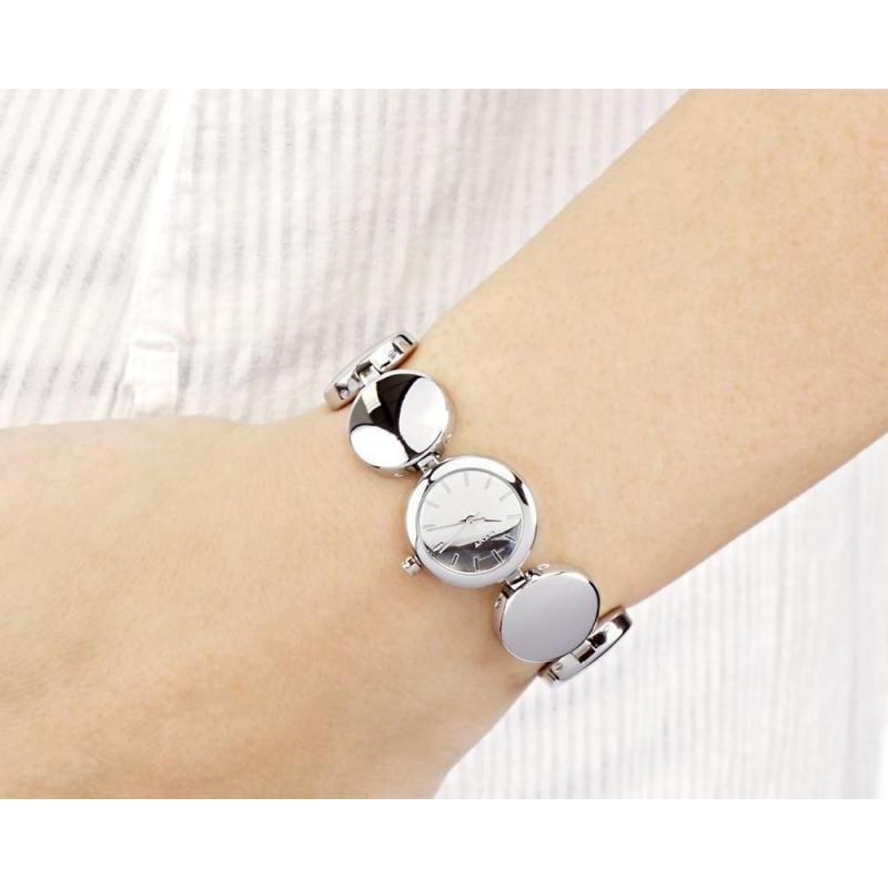 Корпус и браслет выполнены из стали. Цвет циферблата - серебристый. Индикация - метки...