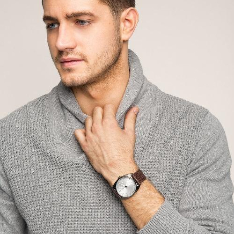 Корпус из нержавеющей стали. Ремешок кожаный, коричневого цвета. Циферблат — белого цвета. Вид цифер..